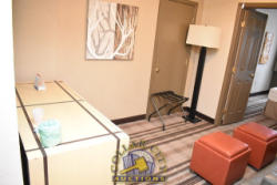ROOM CONTENTS OF ROOM 501 (KING BED ROOM) CONSISTING OF: KING SIZE BED FRAME, HEADBOARD, INCLUDING FREE MATTRESS AND BOX SPRINGS; DRESSER, APPROX 64" X 18"; 2 NIGHTSTAND, APPROX. 24" X 18"; AMANA HEAT & AIR CONDITIONING UNIT, 240 VOLTS; 2 PLASTIC DECK CHAIRS; LAMPS; PEDESTAL LAMP; PULL OUT COUCH, APPROX. 70"; 2 OTTOMANS; APPROX. 22" X 22" COFFEE TABLE; APPROX. 60" X 24" 2-DOOR CABINET; APPROX. 33" SINK; TOILET; IRONING BOARD & IRON; HAIR DRYER. MIRRORS ARE NOT INCLUDED. BEDDING, TVs, COFFEE MAKERS, ETC., IN ANY PHOTOS ARE NOT INCLUDED.