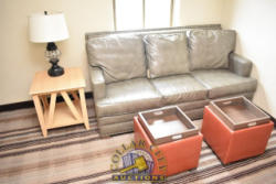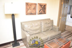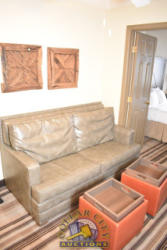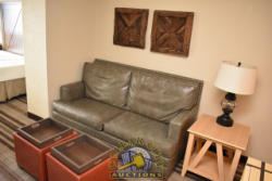 ROOM CONTENTS OF ROOM 519 (KING BED SUITE) CONSISTING OF: KING SIZE BED FRAME, HEADBOARD, INCLUDING FREE MATTRESS & BOX SPRING; 2 NIGHTSTANDS; LAMPS; PEDESTAL LAMP, APPROX. 68" TALL; PULL OUT COUCH, APPROX. 70" WIDE; 2-DOOR CABINET; APPROX. 33" SINK; TOILET; IRONING BOARD & IRON; HAIR DRYER. MIRRORS ARE NOT INCLUDED. BEDDING, TVs, COFFEE MAKERS, ETC., IN ANY PHOTOS ARE NOT INCLUDED.