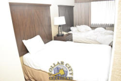 ROOM CONTENTS OF ROOM 610 (2 FULL SIZE BEDS SUITE) CONSISTING OF: 2 FULL SIZE BED FRAMES AND HEADBOARDS, INCLUDING 2 FREE MATTRESSES AND BOX SPRINGS; NIGHTSTAND, APPROX. 24" X 18", DRESSER, APPROX. 64" X 18"; ALARM CLOCK; AMANA AIR CONDITIONER; 2 PLASTIC CHAIRS; 3 ASSORTED LAMPS; APPROX. 30" ROUND TABLE; END TABLES, APPROX. 22" X 22"; APPROX. 60" SINK; TOILET. MIRRORS ARE NOT INCLUDED.