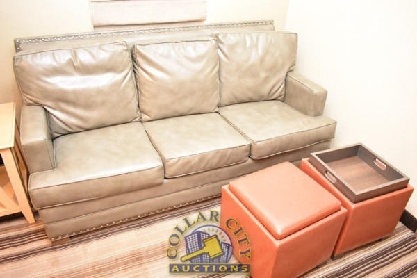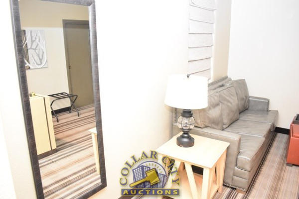 ROOM CONTENTS OF ROOM 601 CONSISTING OF: PULL OUT COUCH, APPROX. 78" LONG; APPROX. 60" X 24" 2-DOOR CABINET; ASSORTED LAMPS; NIGHTSTANDS; OTTOMANS, APPROX. 18" X 18"; PEDESTAL LAMP, APPROX. 68" TALL; ASSORTED PRINTS, APPROX. UP THROUGH 36" X 36"; KING SIZE BED FRAME; WALL MOUNT HEADBOARD, INCLUDING FREE MATTRESS AND BOX SPRINGS; AMANA HEATER/AIR CONDITIONER, 240 VOLTS; ALSO INCLUDES BATHROOM SINK; IRONING BOARD; HAIR DRYER; IRON; ALARM CLOCK; AND CURTAINS; MIRRORS ARE NOT INCLUDED.