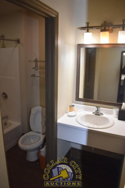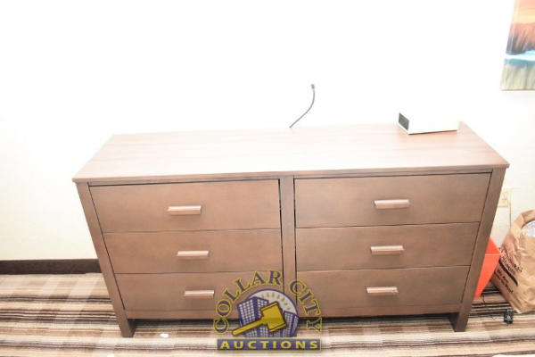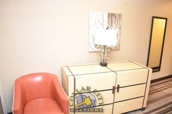 #6 – ROOM CONTENTS OF ROOM 604 CONSISTING OF: APPROX. 60" X 24" 2-DOOR CABINET AND DRESSER APPROX. 64" X 18"; APPROX. 30" ROUND TABLE; UPHOLSTERED CHAIRS; VINYL CHAIRS; ASSORTED ARTWORK, APPROX. 24" X 36" & 30" X 30"; 68" PEDESTAL LAMPS; 2 PLASTIC CHAIRS; GE HEATER/AIR CONDITIONER, 240 VOLTS; 2 FULL SIZE BED FRAMES WITH HEADBOARDS INCLUDING FREE MATTRESSES AND BOX SPRINGS; ALARM CLOCK; BATHROOM SINK & TOILET. MIRRORS ARE NOT INCLUDED.