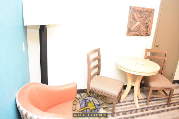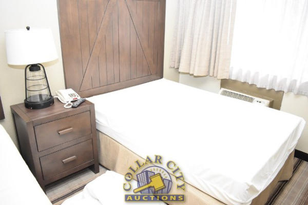 ROOM CONTENTS OF ROOM 604 CONSISTING OF: APPROX. 60" X 24" 2-DOOR CABINET AND DRESSER APPROX. 64" X 18"; APPROX. 30" ROUND TABLE; UPHOLSTERED CHAIRS; VINYL CHAIRS; ASSORTED ARTWORK, APPROX. 24" X 36" & 30" X 30"; 68" PEDESTAL LAMPS; 2 PLASTIC CHAIRS; GE HEATER/AIR CONDITIONER, 240 VOLTS; 2 FULL SIZE BED FRAMES WITH HEADBOARDS INCLUDING FREE MATTRESSES AND BOX SPRINGS; ALARM CLOCK; BATHROOM SINK & TOILET. MIRRORS ARE NOT INCLUDED.