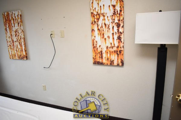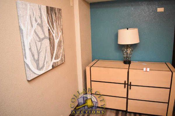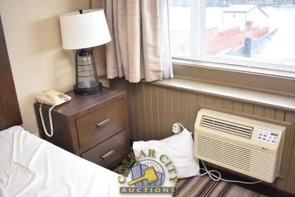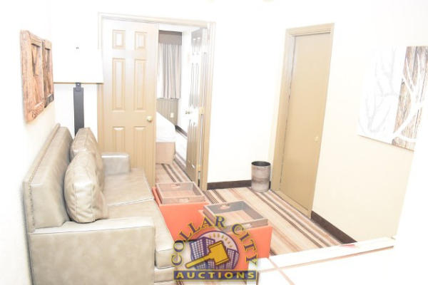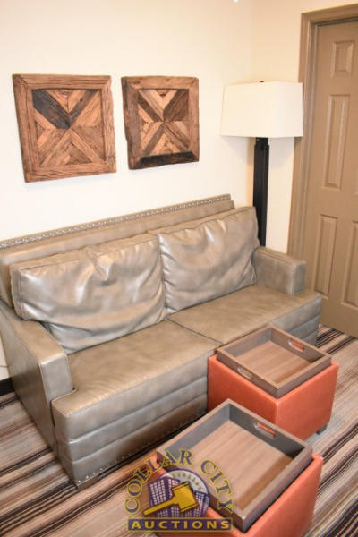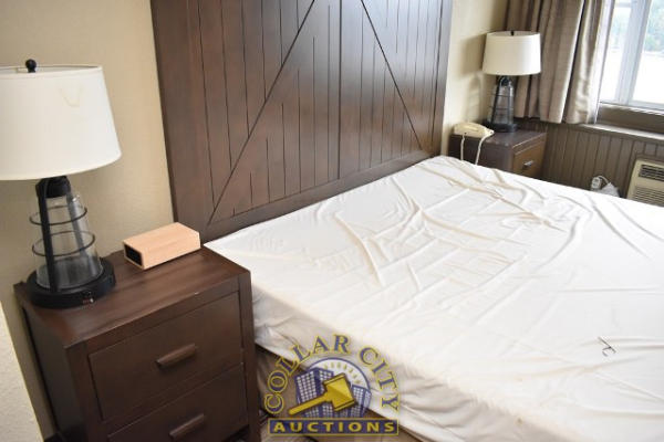 ROOM CONTENTS OF ROOM 618 (KING ROOM) CONSISTING OF: APPROX. 70" PULL OUT COUCH; APPROX. 60" X 24" 2-DOOR CABINET; 2 OTTOMANS; 2 PEDESTAL LAMPS, APPROX. 68"; 2 NIGHTSTANDS, APPROX. 24" X 18"; KING SIZE BED FRAME AND HEADBOARD WITH FREE MATTRESS AND BOX SPRING; AMANA HEATING & AIR CONDITIONING UNIT, 240 VOLTS; ASSORTED PRINTS, APPROX. 30" X 30", 36" X 18". MIRRORS ARE NOT INCLUDED.