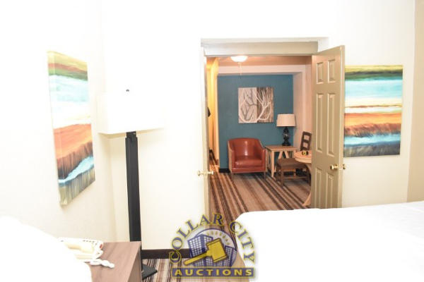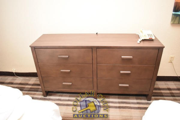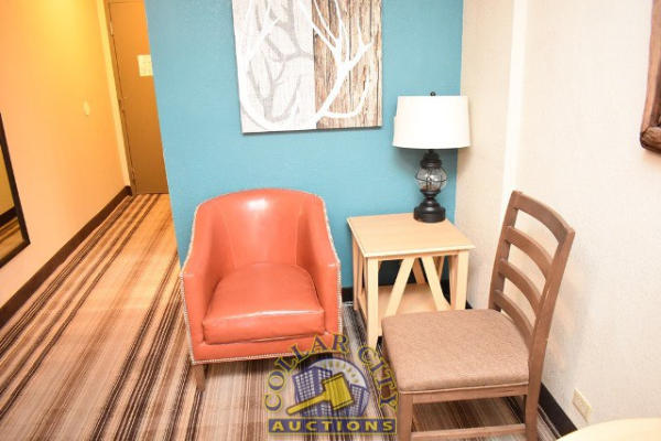 ROOM CONTENTS OF ROOM 606 (DOUBLE FULL SIZE BED SUITE HOTEL ROOM) CONSISTING OF: APPROX. 30" ROUND TABLE; ASSORTED PRINTS, APPROX. 30" X 30", 36" X 18"; 2 PEDESTAL LAMPS, APPROX. 68"; WARDROBE, APPROX. 53" WIDE X 84" TALL X 26" DEEP; 2 FULL SIZE BED FRAMES, HEADBOARDS, WITH FREE MATTRESSES AND BOX SPRINGS; ALARM CLOCK; LAMPS; AMANA HEATING AND AIR CONDITIONING UNIT, 240 VOLTS; PLASTIC CHAIR; SINK, APPROX. 33"; TOILET. MIRRORS ARE NOT INCLUDED.