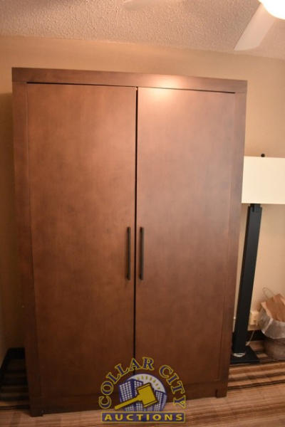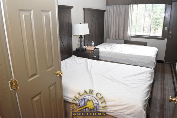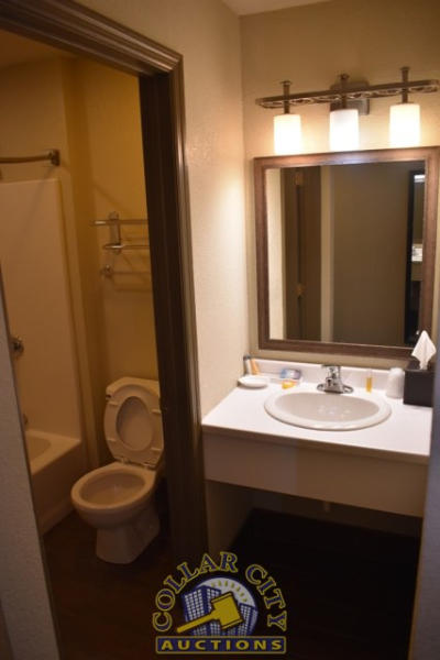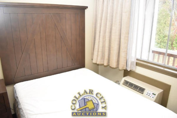 #10 – ROOM CONTENTS OF ROOM 606 (DOUBLE FULL SIZE BED SUITE HOTEL ROOM) CONSISTING OF: APPROX. 30" ROUND TABLE; ASSORTED PRINTS, APPROX. 30" X 30", 36" X 18"; 2 PEDESTAL LAMPS, APPROX. 68"; WARDROBE, APPROX. 53" WIDE X 84" TALL X 26" DEEP; 2 FULL SIZE BED FRAMES, HEADBOARDS, WITH FREE MATTRESSES AND BOX SPRINGS; ALARM CLOCK; LAMPS; AMANA HEATING AND AIR CONDITIONING UNIT, 240 VOLTS; PLASTIC CHAIR; SINK, APPROX. 33"; TOILET. MIRRORS ARE NOT INCLUDED.