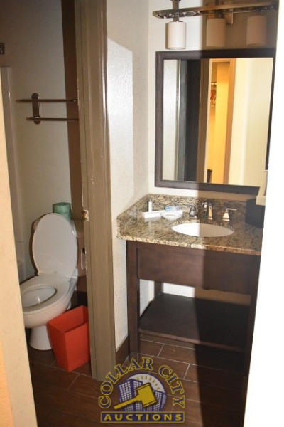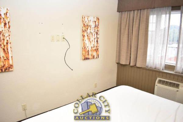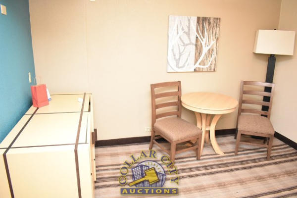 ROOM CONTENTS OF ROOM 617 (KING SIZE ROOM) CONSISTING OF: APPROX. 60" X 24" 2-DOOR CABINET; APPROX. 30" ROUND TABLE; 2 UPHOLSTERED CHAIRS; 2 APPROX 68" PEDESTAL LAMPS; 3 ASSORTED LAMPS; PRINTS, APPROX. 36" X 18" AND 30" X 30", APPROX. 70" PULL OUT COUCH; KING SIZE BED FRAME, HEADBOARD, INCLUDES FREE MATTRESS AND BOX SPRINGS; 2 NIGHTSTANDS, APPROX. 24" X 18"; GE HEATER & AIR CONDITIONER, 240 VOLTS; SINK, APPROX. 33"; TOILET; IRONING BOARD & IRON; BLOW DRYER. MIRRORS ARE NOT INCLUDED.