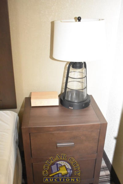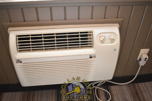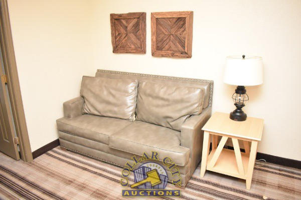 #11 – ROOM CONTENTS OF ROOM 617 (KING SIZE ROOM) CONSISTING OF: APPROX. 60" X 24" 2-DOOR CABINET; APPROX. 30" ROUND TABLE; 2 UPHOLSTERED CHAIRS; 2 APPROX 68" PEDESTAL LAMPS; 3 ASSORTED LAMPS; PRINTS, APPROX. 36" X 18" AND 30" X 30", APPROX. 70" PULL OUT COUCH; KING SIZE BED FRAME, HEADBOARD, INCLUDES FREE MATTRESS AND BOX SPRINGS; 2 NIGHTSTANDS, APPROX. 24" X 18"; GE HEATER & AIR CONDITIONER, 240 VOLTS; SINK, APPROX. 33"; TOILET; IRONING BOARD & IRON; BLOW DRYER. MIRRORS ARE NOT INCLUDED.