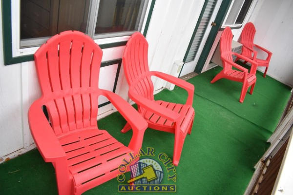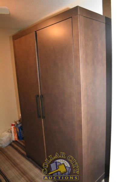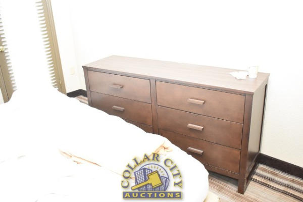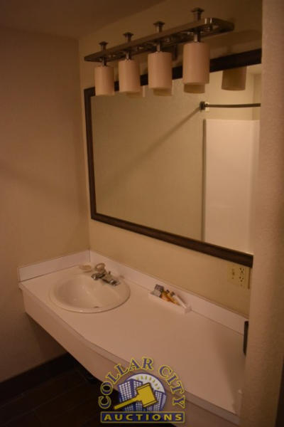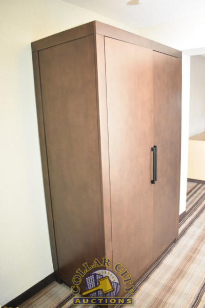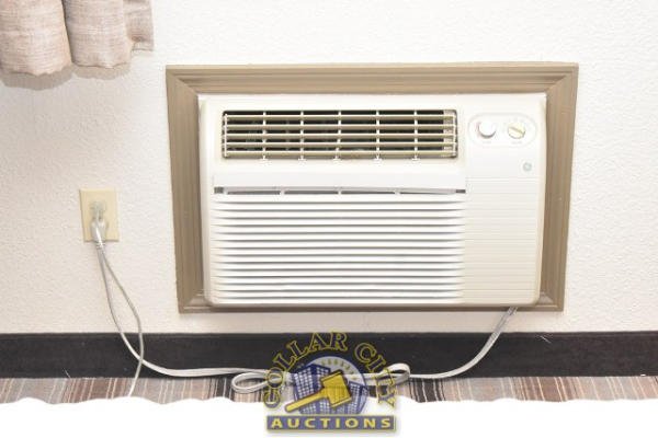 #12 – ROOM CONTENTS OF ROOM 607 (KING SIZE ROOM) CONSISTING OF: WARDROBE, APPROX. 53" WIDE X 84" WIDE X 26" DEEP; APPROX. 36" ROUND PEDESTAL TABLE; 2 UPHOLSTERED CHAIRS; PULL OUT COUCH, APPROX. 79" LONG; 2 APPROX. 30" COFFEE TABLES; 2 APPROX. 68" LAMPS; ASSORTED ARTWORK, APPROX. 30" X 30"; KING SIZE BED FRAME WITH FREE MATTRESS AND BOX SPRING; HEADBOARD; ALARM CLOCK; LAMPS; GE HEATER/AIR CONDITIONER, 110 VOLTS; 4 PLASTIC DECK CHAIRS; CURTAINS; TOILET; SINK, APPROX. 60". MIRRORS ARE NOT INCLUDED.