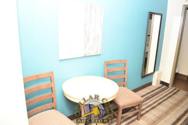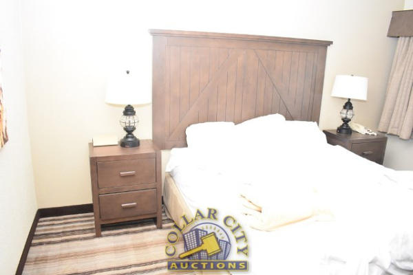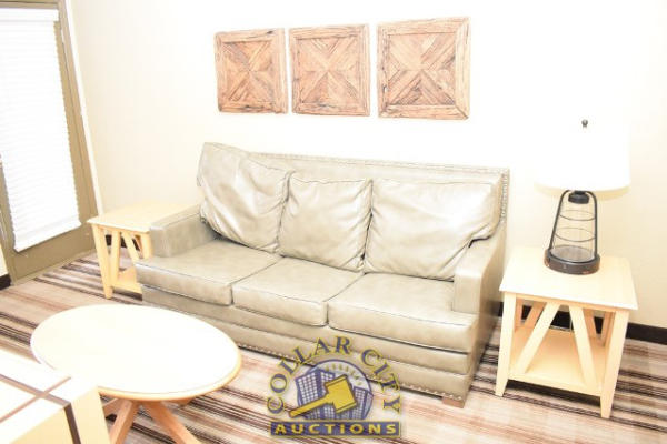 ROOM CONTENTS OF ROOM 607 (KING SIZE ROOM) CONSISTING OF: WARDROBE, APPROX. 53" WIDE X 84" WIDE X 26" DEEP; APPROX. 36" ROUND PEDESTAL TABLE; 2 UPHOLSTERED CHAIRS; PULL OUT COUCH, APPROX. 79" LONG; 2 APPROX. 30" COFFEE TABLES; 2 APPROX. 68" LAMPS; ASSORTED ARTWORK, APPROX. 30" X 30"; KING SIZE BED FRAME WITH FREE MATTRESS AND BOX SPRING; HEADBOARD; ALARM CLOCK; LAMPS; GE HEATER/AIR CONDITIONER, 110 VOLTS; 4 PLASTIC DECK CHAIRS; CURTAINS; TOILET; SINK, APPROX. 60". MIRRORS ARE NOT INCLUDED.