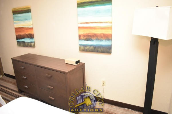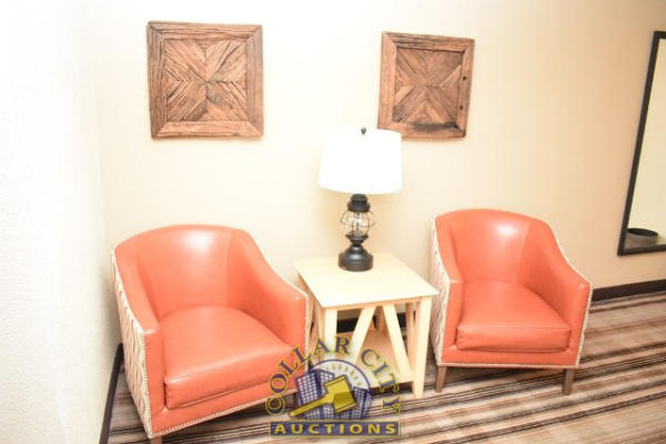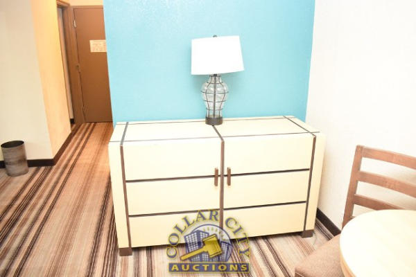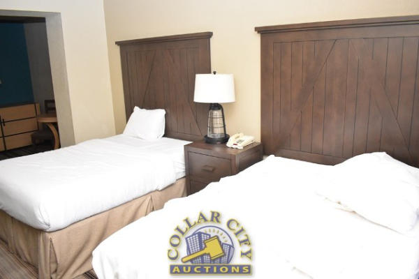 ROOM CONTENTS OF ROOM 609 (2 FULL SIZE BEDS ROOM) CONSISTING OF: APPROX. 60" X 24" 2-DOOR CABINET; APPROX. 30" ROUND TABLE; 2 UPHOLSTERED CHAIRS; 2 VINYL UPHOLSTERED CHAIRS; APPROX. 30" X 30" NIGHTSTAND; LAMPS; 2 FULL SIZE BED FRAMES, HEADBOARDS WITH FREE MATTRESSES AND BOX SPRINGS; DRESSER, APPROX. 60" X 18"; ALARM CLOCK; 1 PEDESTAL LAMP; ASSORTED LAMPS; AMANA HEAT & AIR CONDITIONING UNIT, 240 VOLTS; 2 PLASTIC CHAIRS. MIRRORS ARE NOT INCLUDED.