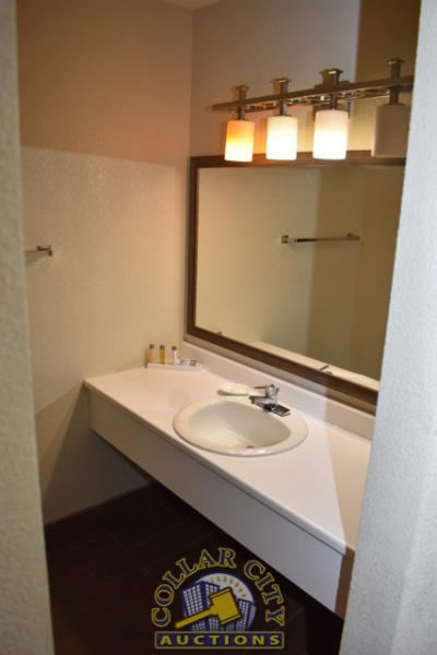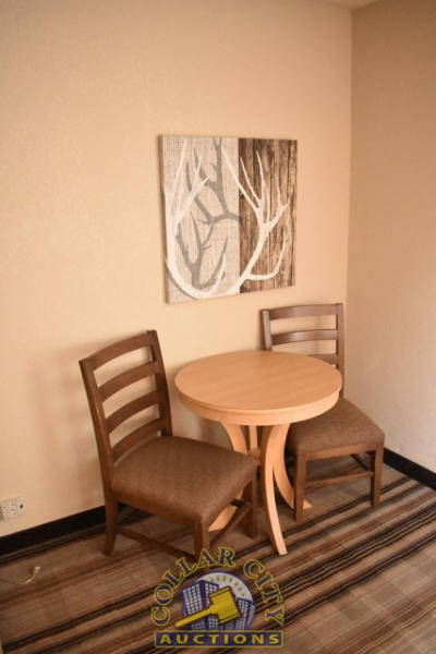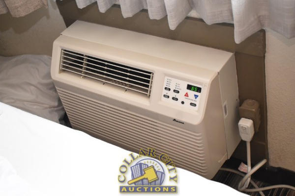 #16 – ROOM CONTENTS OF ROOM 609 (2 FULL SIZE BEDS ROOM) CONSISTING OF: APPROX. 60" X 24" 2-DOOR CABINET; APPROX. 30" ROUND TABLE; 2 UPHOLSTERED CHAIRS; 2 VINYL UPHOLSTERED CHAIRS; APPROX. 30" X 30" NIGHTSTAND; LAMPS; 2 FULL SIZE BED FRAMES, HEADBOARDS WITH FREE MATTRESSES AND BOX SPRINGS; DRESSER, APPROX. 60" X 18"; ALARM CLOCK; 1 PEDESTAL LAMP; ASSORTED LAMPS; AMANA HEAT & AIR CONDITIONING UNIT, 240 VOLTS; 2 PLASTIC CHAIRS. MIRRORS ARE NOT INCLUDED.