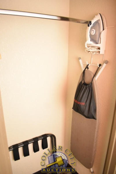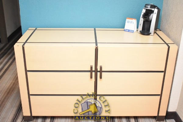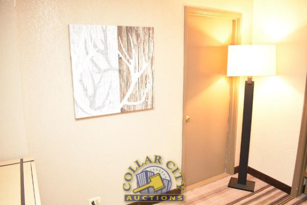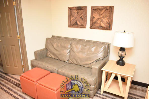 ROOM CONTENTS OF ROOM 519 (KING BED SUITE) CONSISTING OF: KING SIZE BED FRAME, HEADBOARD, INCLUDING FREE MATTRESS & BOX SPRING; 2 NIGHTSTANDS; LAMPS; PEDESTAL LAMP, APPROX. 68" TALL; PULL OUT COUCH, APPROX. 70" WIDE; 2-DOOR CABINET; APPROX. 33" SINK; TOILET; IRONING BOARD & IRON; HAIR DRYER. MIRRORS ARE NOT INCLUDED. BEDDING, TVs, COFFEE MAKERS, ETC., IN ANY PHOTOS ARE NOT INCLUDED.