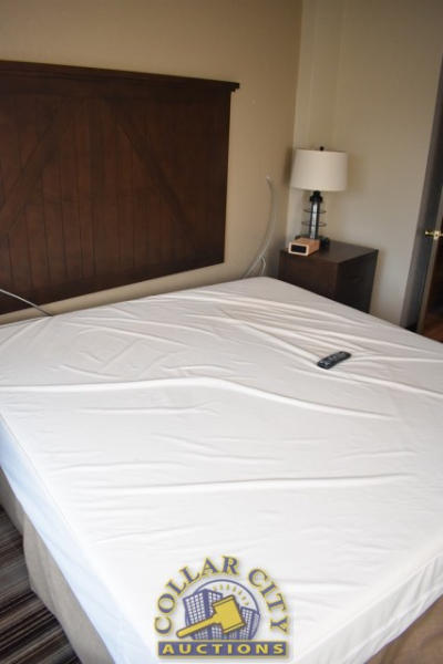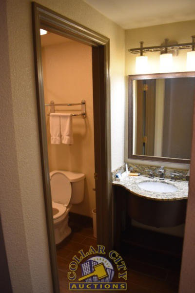 #30 – ROOM CONTENTS OF ROOM 519 (KING BED SUITE) CONSISTING OF: KING SIZE BED FRAME, HEADBOARD, INCLUDING FREE MATTRESS & BOX SPRING; 2 NIGHTSTANDS; LAMPS; PEDESTAL LAMP, APPROX. 68" TALL; PULL OUT COUCH, APPROX. 70" WIDE; 2-DOOR CABINET; APPROX. 33" SINK; TOILET; IRONING BOARD & IRON; HAIR DRYER. MIRRORS ARE NOT INCLUDED. BEDDING, TVs, COFFEE MAKERS, ETC., IN ANY PHOTOS ARE NOT INCLUDED.