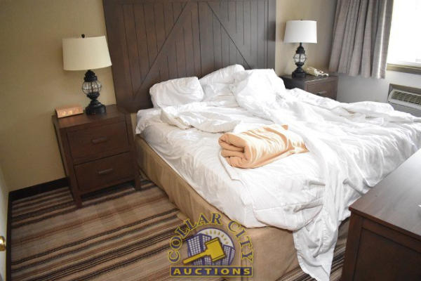 ROOM CONTENTS OF ROOM 507 (KING BED SUITE) CONSISTING OF: KING SIZE BED FRAME, HEADBOARD, INCLUDING FREE MATTRESS & BOX SPRING; 2 END STANDS; LAMPS; DRESSER; APPROX. 60" X 24" 2-DOOR CABINET; SINK & TOILET; ASSORTED CHAIRS; PULL OUT COUCH. MIRRORS ARE NOT INCLUDED. BEDDING, TVs, COFFEE MAKERS, ETC., IN ANY PHOTOS ARE NOT INCLUDED.