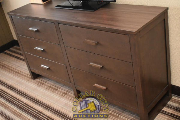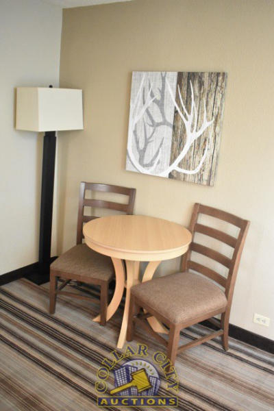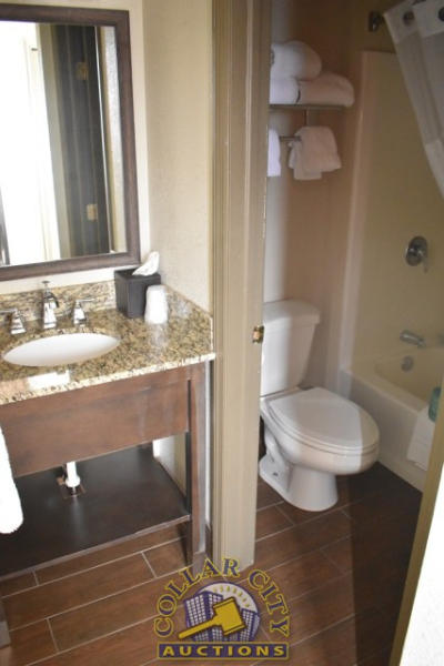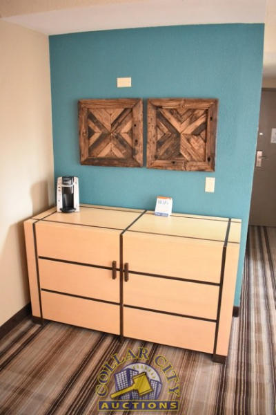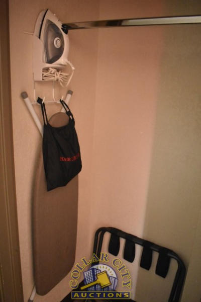 #39 – ROOM CONTENTS OF ROOM 512 (DOUBLE FULL SIZE ROOM) CONSISTING OF: 2 FULL SIZE BED FRAMES, WALL MOUNT HEADBOARDS; INCLUDING FREE MATTRESSES AND BOX SPRINGS; AMANA HEAT AND AIR CONDITIONING UNIT, 240 VOLTS; NIGHTSTAND; DRESSER, APPROX. 60" X 18"; APPROX. 68" TALL PEDESTAL LAMP; APPROX. 30" ROUND TABLE; 2-DOOR CABINET; APPROX. 33" SINK; TOILET; IRON AND IRONING BOARD; HAIR DRYER. MIRRORS ARE NOT INCLUDED. BEDDING, TVs, COFFEE MAKERS, ETC., IN ANY PHOTOS ARE NOT INCLUDED.