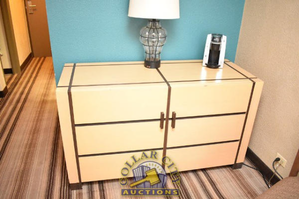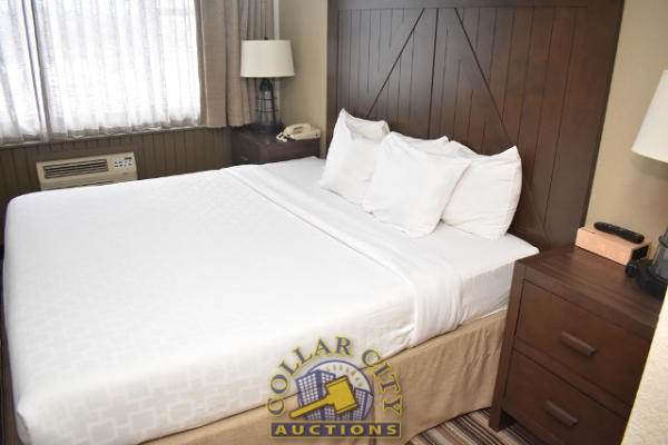 ROOM CONTENTS OF ROOM 513 (KING BED ROOM) CONSISTING OF: KING SIZE BED FRAME, WALL MOUNT HEADBOARD, INCLUDING FREE MATTRESS AND BOX SPRINGS; PULL OUT COUCH; 2-DOOR CABINET; NIGHTSTAND; IRONING BOARD AND IRON; HAIR DRYER. MIRRORS ARE NOT INCLUDED. BEDDING, TVs, COFFEE MAKERS, ETC., IN ANY PHOTOS ARE NOT INCLUDED.