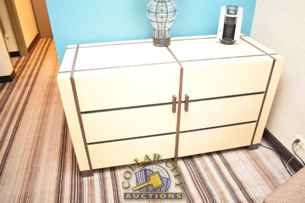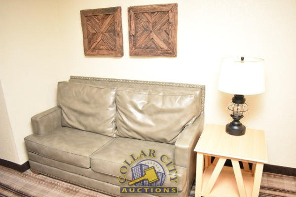 #42 – ROOM CONTENTS OF ROOM 515 (KING BED ROOM) CONSISTING OF: KING SIZE BED FRAME, WALL MOUNT HEADBOARD, INCLUDING FREE MATTRESS AND BOX SPRINGS; PULL OUT COUCH; 2-DOOR CABINET; NIGHTSTAND; IRONING BOARD AND IRON; HAIR DRYER. MIRRORS ARE NOT INCLUDED. BEDDING, TVs, COFFEE MAKERS, ETC., IN ANY PHOTOS ARE NOT INCLUDED.