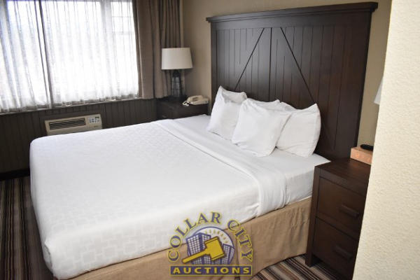ROOM CONTENTS OF ROOM 515 (KING BED ROOM) CONSISTING OF: KING SIZE BED FRAME, WALL MOUNT HEADBOARD, INCLUDING FREE MATTRESS AND BOX SPRINGS; PULL OUT COUCH; 2-DOOR CABINET; NIGHTSTAND; IRONING BOARD AND IRON; HAIR DRYER. MIRRORS ARE NOT INCLUDED. BEDDING, TVs, COFFEE MAKERS, ETC., IN ANY PHOTOS ARE NOT INCLUDED.