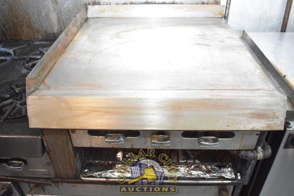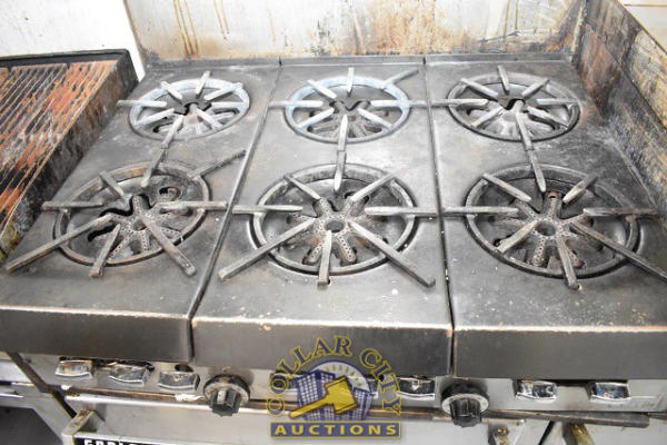 GARLAND DOUBLE OVEN WITH 6 BURNERS AND A 24" GRIDDLE, WITH BACKSPLASH, APPROX. 60" WIDE, PROPANE