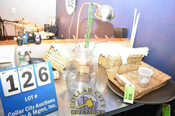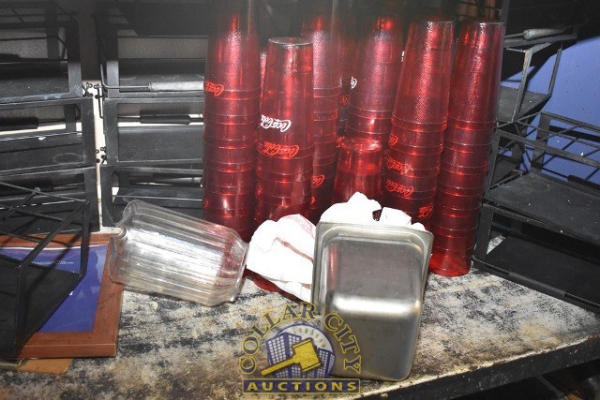 CONTENTS OF WORK TABLE CONSISTING OF BASKETS, COCA COLA CUPS, ETC.