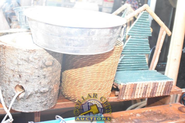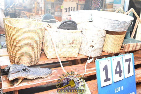 SHELF LOT OF ASSORTED BASKETS AND DECORATIONS