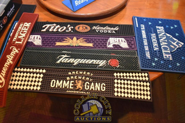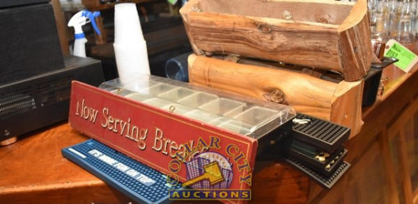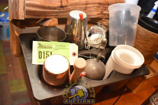 LOT OF BAR ITEMS, MIXING CUPS, RUBBER MATS, CHEETOS, CHEETOS CONTAINER