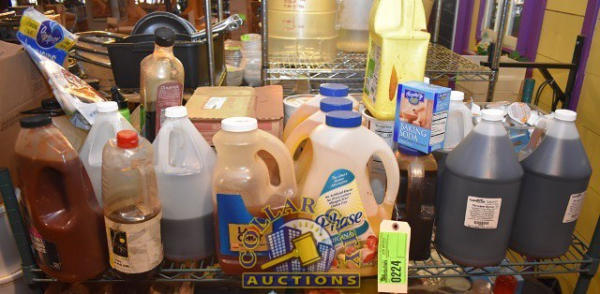 SHELF LOT OF ASSORTED FOODS INCLUDING PANCAKE SYRUP