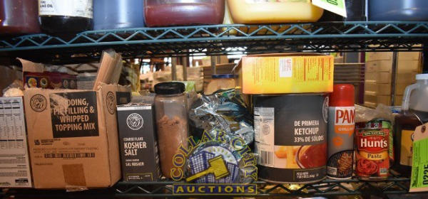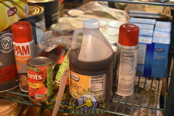 SHELF LOT OF ASSORTED FOODS INCLUDING SALT, KETCHUP, ETC.