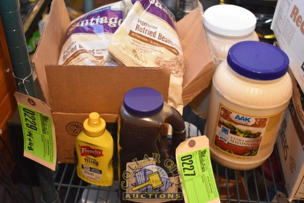 SHELF LOT OF FOOD INCLUDING VEGETARIAN REFRIED BEANS, MAYONNAISE