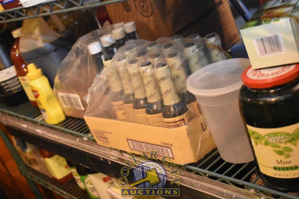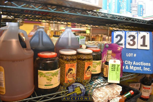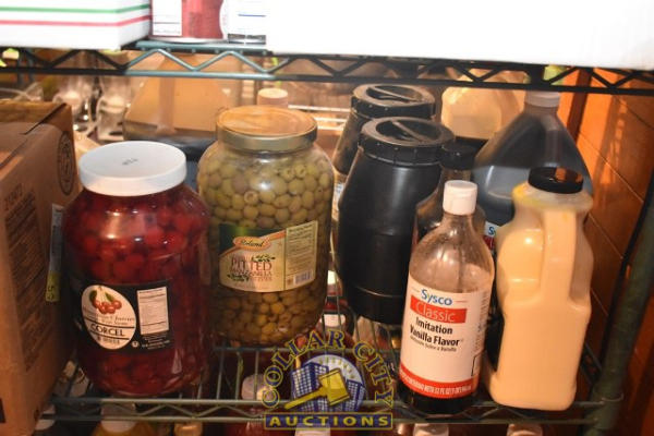 SHELF LOT OF FOOD CONSISTING OF CHERRIES, OLIVES, ETC.