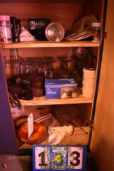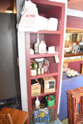 SHELVING UNIT CONTENTS CONSISTING OF TO-GO CONTAINERS, SALT, PEPPER SAUCE, CUPS