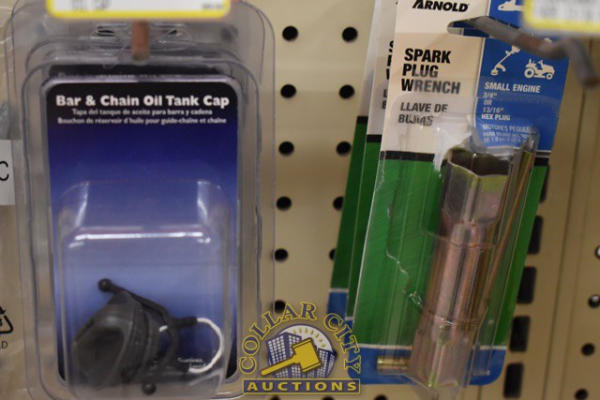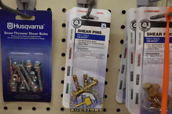 LOT OF TROYBILT PARTS, HUSQVARNA PARTS, CONSISTING OF SNOW THROWER SHEAR BOLTS, SHEAR PINS, BAR & CHAIN OIL TANK CAP, SPARK PLUG WRENCH, ETC.