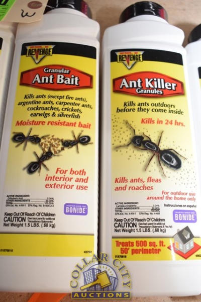 LOT OF 3 REVENGE ANT KILLER GRANULES, 1.5 LB CONTAINERS AND 4 CONTAINERS OF ANT BAIT