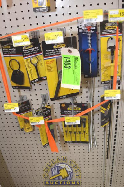 LOT OF GENERAL TOOLS INCLUDING TELESCOPIC INSPECTION MIRROR, TWEEZERS MAGNIFIER, POCKET MAGNIFIER, JEWELS SCREWDRIVER, PRECISION SCREWDRIVER SET, ETC.