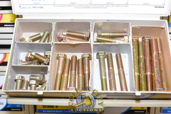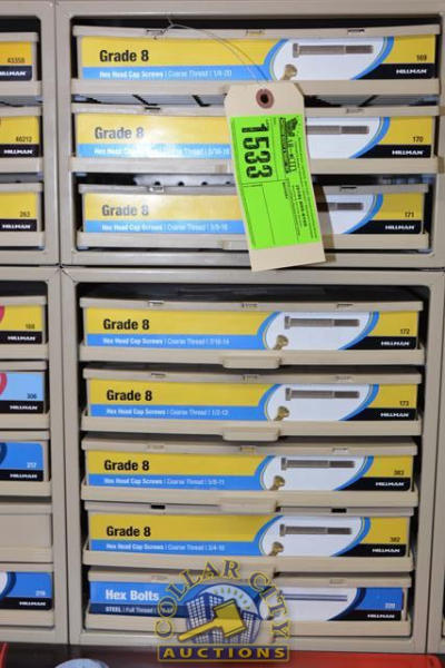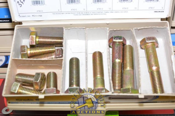 ORGANIZER BIN WITH CONTENTS CONSISTING OF GRADE 8 HEX HEAD CAP SCREWS, BOLTS