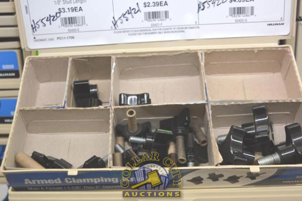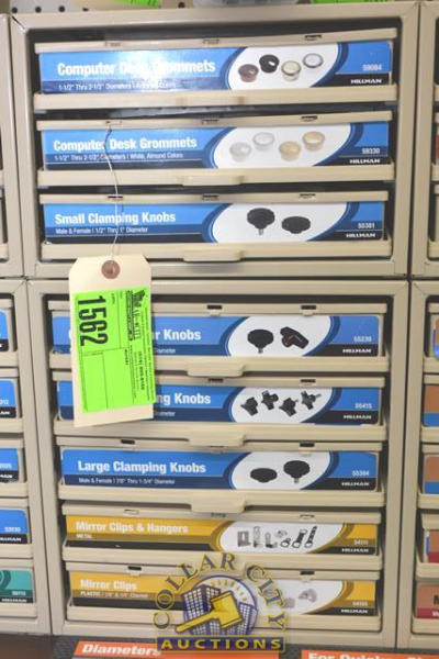 ORGANIZER BIN WITH CONTENTS CONSISTING OF COMPUTER DESK GROMMETS, CLAMPING AN BAR KNOBS, MIRROR CLIPS AND HANGERS