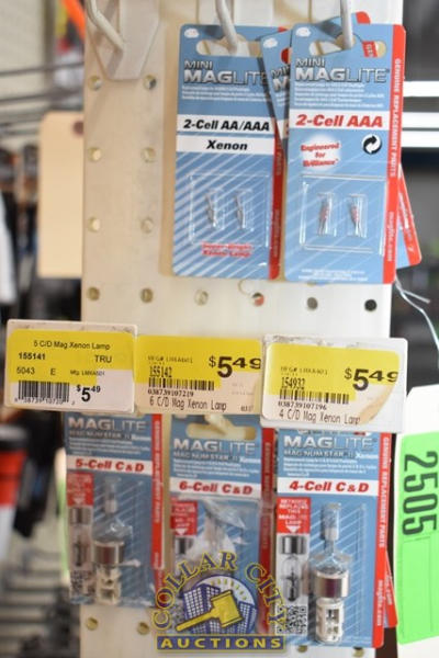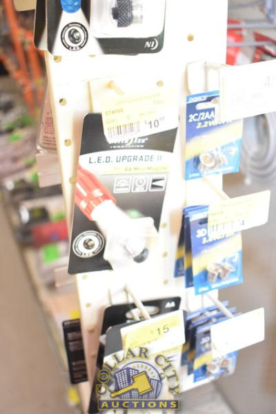 SMALL DISPLAY RACK OF MAGLITE LIGHT BULBS, DEWALT FLASHLIGHT BULBS, ETC.