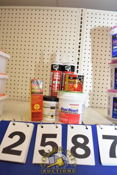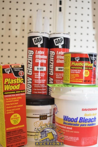 LOT OF 3 TUBES OF LATEX WINDOW GLAZING, DAP PLASTIC WOOD, WOOD BLEACH, ETC.