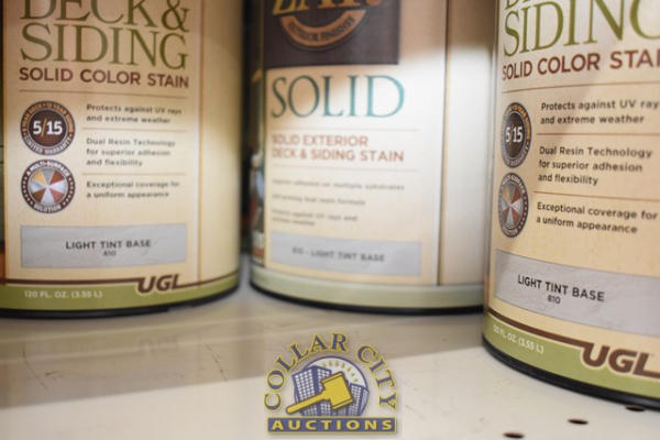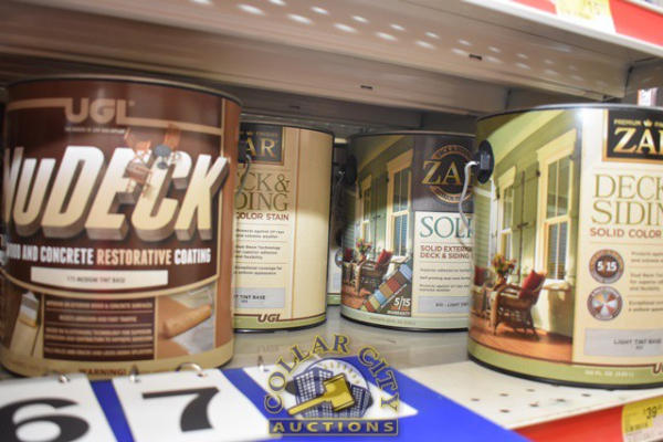 LOT OF 9 GALLONS OF ZAR DECK AND SIDING COLOR STAIN AND UGL NUDECK WOOD AND CONCRETE RESTORATION COATING