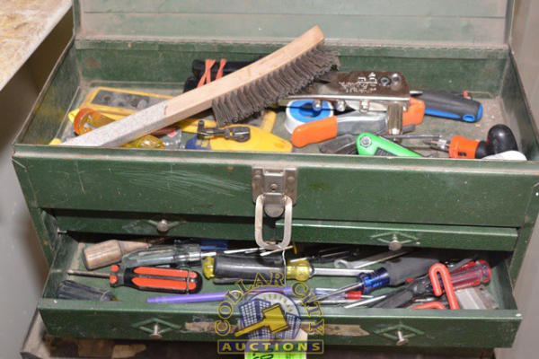 ROLL AROUND TOOLBOX WITH CONTENTS OF TOOLS CONSISTING OF SCREWDRIVERS, PLIERS, POP RIVET GUN, WIRE BRUSH, ETC.