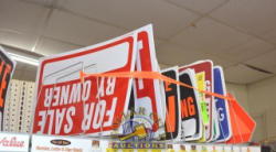 LOT OF SIGNS INCLUDING "FOR SALE BY OWNER", "FOR RENT", "FOR SALE", "NO TRESPASSING", TRIANGLE