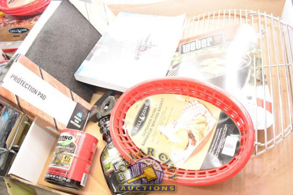 BOX LOT CONSISTING OF BARBECUE SERVING BASKETS, WEBER COOKING GRATE (17 1/2" ROUND), WEBER CHARCOAL GRILLING BOOK, STAINLESS STEEL POLISH, STERNO, AND GAS GRILL PROTECTION PAD (48" X 30")