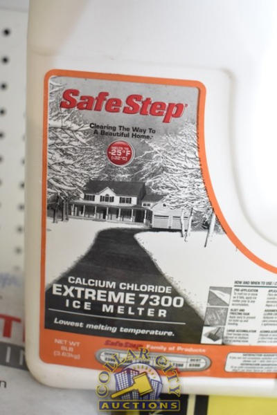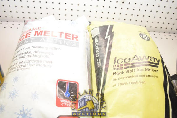 LOT CONSISTING OF 2 BAGS OF FAST MELT ICE MELT, 2 BAGS OF ICE AWAY, A SPREADER, AND 1 JUG OF SAFE STEP CALCIUM CHLORIDE ICE MELTER.