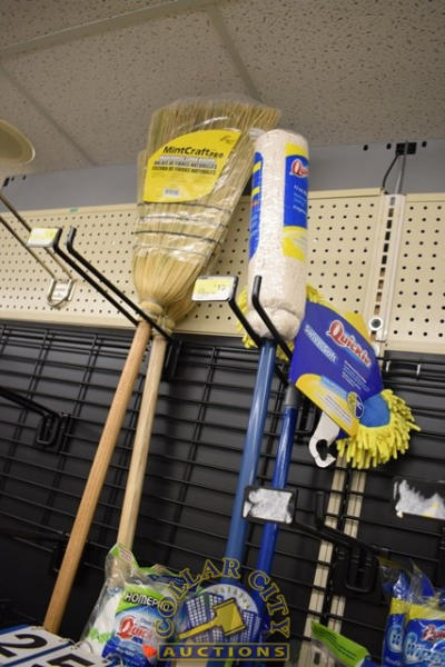 LARGE LOT CONSISTING OF MOP HEADS, MOPS, BROOMS