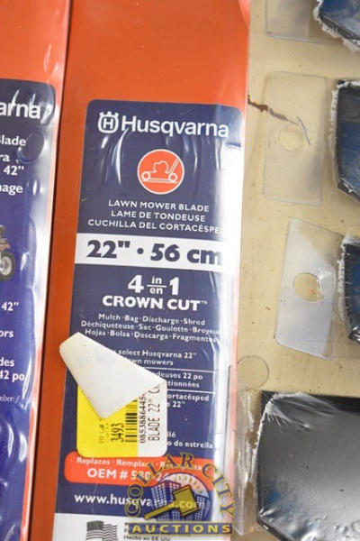 LOT OF ASSORTED HUSQVARNA MOWER AND DE-THATCHING BLADES