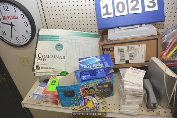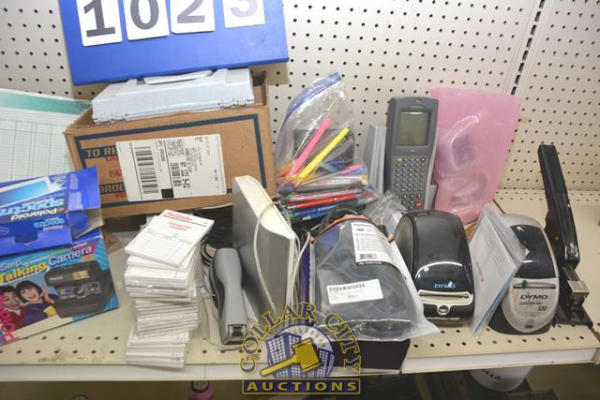 SHELF LOT WITH OFFICE SUPPLIES, POLAROID CAMERA, DYNAMO LABEL PRINTERS