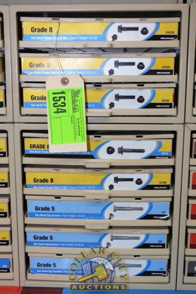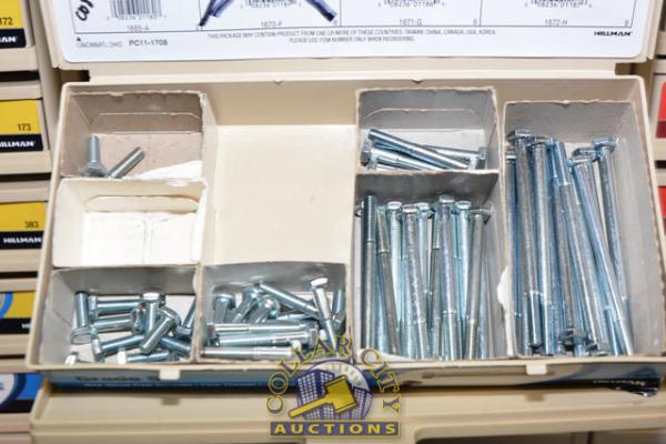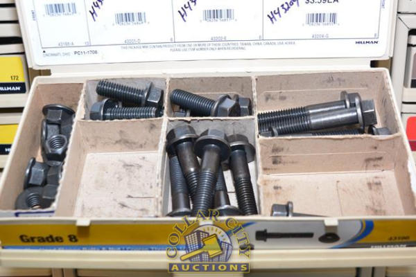 ORGANIZER BIN WITH CONTENTS CONSISTING OF BOTH GRADE 8 AND GRADE 5 BOLTS AND NUTS
