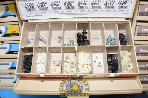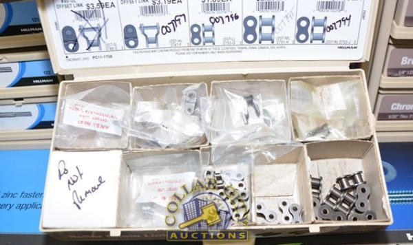ORGANIZER BIN WITH GRADE 5 BOLTS, AUTOMOTIVE STUDS, BODY BOLTS, LICENSE PLATE SCREWS AND NUTS AND ROLLER CHAIN