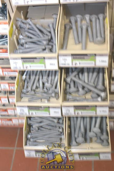 ORGANIZER BINS WITH CONTENTS CONSISTING OF GALVANIZED NUTS AND CARRIAGE BOLTS, 3/8" X 2 1/2" - 1/2" X 12"
