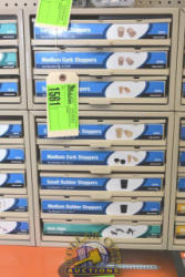 ORGANIZER BIN WITH CONTENTS CONSISTING OF CORKS, RUBBER STOPPERS, SINK CLIPS